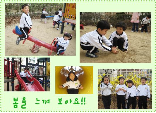 - 똑똑!! 따뜻한 봄이 찾아왔어요!! 꽃잎반 친구들과 유치원 앞마당에서 나무, 꽃, 바람.. 봄의 기운을 느껴보며 놀이터에서 즐거운 바깥놀이 시간도 가졌답니다.