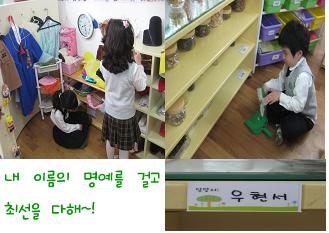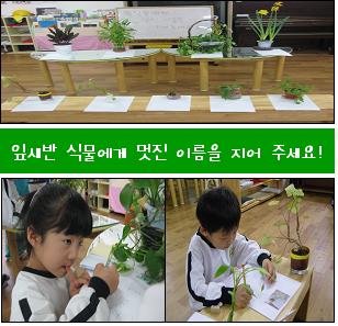 잎새반 친구들이 함께 사용하는 공간의 소중함을 나누고 애착을 가지게 하기 위해 각자 영역별로 청소구역을 정해 주었답니다. 정해진 구역 앞에는 유아들의 이름을 써서 담당자 이름표도 붙여주었어요. 자신이 맡은 영역에 책임감을 가지고 더 깨끗이 하는 아이들의 모습에서 일곱 살 형님의 향기가 물씬 풍긴답니다.<식물 멋진 이름 지어주기>