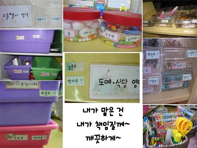 우리의 생각을 표현하는데 쓰이는 소중한 매체물을 정리하는 것도 우리의 몫이지요. 내가 정리하고 싶은 매체물에 <내 이름>을 붙이고 <즐거운 정리시간>이 되면 걸레로 닦고, 섞인 매체물을 제자리에 정리하며 맡은 일에 최선을 다합니다.