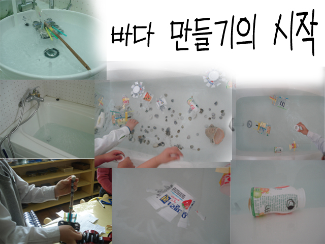 몇 명의 친구들이 조형영역에서 배를 만든 것에서부터 바다 만들기는 시작됩니다. 그렇게 만든 배를 세면대에 물을 받아서 띄워봅니다. 하지만 세면대보다 큰 배는 물에 뜨지 않고 세면대에 걸쳐져 있습니다.