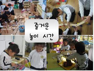 쌓기 영역에서 블록으로 동물과 사람이 사는 마을을 구성하고 있구요, 조형 영역에서는 보물 상자, 표지판, 팽이를 만들고 있습니다. 구슬 영역에서는 멋진 목걸이를 만들고, 편지 영역에서는 내가 좋아하는 친구에게 편지를 쓰기도 합니다. 미술 영역에서는 그림을 그리는 친구들도 있습니다.