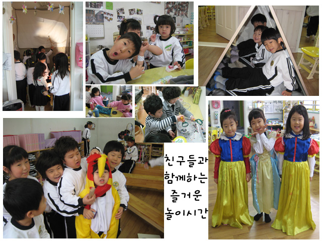 유치원에는 신나고 재미있는 것들이 정말 많아요. 예쁜 공주님 옷, 뚝딱 뚝딱 뭐든지 만들 수 있는 여러 가지 매체물들, 요리 조리 쌓을 수 있는 블록들, 빛으로 만들어보는 그림자 놀이, 조물조물 찰흙영역, 알록달록 구슬꿰기...