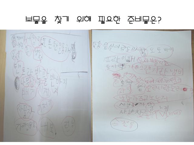 교사 : 그럼 보물지도를 가지고 보물을 찾으러 가려면 준비물도 있어야겠네?유아들은 물, 나침반, 튼튼한 운동화, 옷, 불, 총, 사냥 옷, 텐트, 삽, 자동차, 기저귀, 갑옷, 음식이랑 도마, 활, 오토바이, 프라이팬, 진짜 보물지도, 도시락, 칫솔, 치약, TV, 열쇠, 손전등 등의 준비물이 필요하다고 합니다. 그 때,