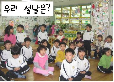 유아5: 설날이 되면 한복을 입고 할아버지, 할머니한테 세배를 해요. 유아6: 세배하면 세뱃돈을 받아요. 그래서 좋아요. 교사: 우리 친구들은 예절시간에 절하는 방법을 배웠으니깐 멋지게 세배할 수 있겠죠?유아6: 저 잘 할 수 있어요!! 유아7: 나는 그 날 안 와서 잘 모르겠어요. 유아6: 그럼 내가 가르쳐 줄게!(절하는 방법을 알려준다.)