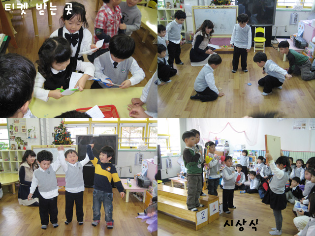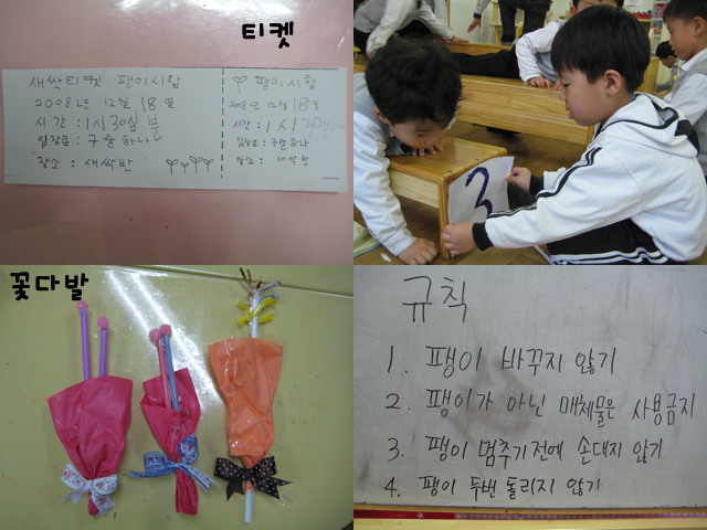 지난 번 대회를 마친 뒤 한 유아가 우승한 유아의 팽이는 (만든)팽이가 아니라 ‘단추’였다는 점을 지적하였다. 그래서 아이들은 다시 새로운 규칙을 정하였고 한 번 더 시합을 열기로 하였다. 준비된 응원단, 완성된 티켓, 시상대 숫자, 메달과 함께 주는 꽃다발까지... 완벽한 준비를 해 두고 다시 시합은 진행되었다. 시합 당일 날, 우리 유치원을 구경하러 온 학생선생님들까지 우리반에 와서 시합을 지켜보았고 토너먼트식으로 진행된 게임은 이제 아이들에게 너무 익숙해져 진행이 순조로웠다. 그렇게 두 번 째 경기에서는 치백이가 금메달, 한수가 은메달, 재혁이가 동메달을 따게 되었다. 그리고 멋진 경기에 이어 시상식까지 완벽하게 해볼 수 있어 좋은 경험이 되었던 하루였다.그렇게 두 번의 경기를 끝으로 방학을 맞이하게 되었고 방학이 끝난 뒤 다시 만난 아이들은 팽이경기를 잊은 듯하였다. 그렇게 한 주가 흐르고 난 뒤 어느 날 갑자기 “우리 팽이시합 목요일에 하기로 했으니깐 그때 하자!”라는 반가운 소리가 들렸다. 과연 아이들은 다시 팽이 시합을 할 수 있을 것인지 기대해본다.