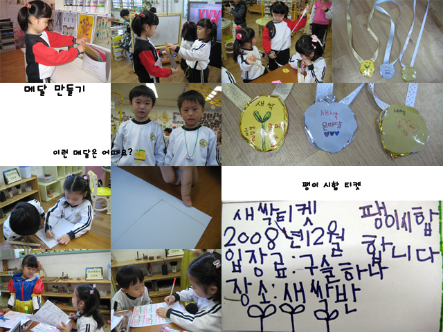 시합준비를 하면서 교실은 더욱 분주해졌다. 금메달, 은메달, 동메달도 만들어야했고 티켓도 만들어야했다. 아이들은 인터넷으로 검색해서 메달을 찾아보기도하고 티켓을 찾아서 모양을 살피며 만들기를 시작하였다. 그리고 공유시간...