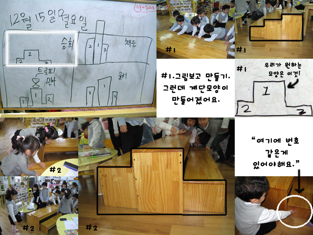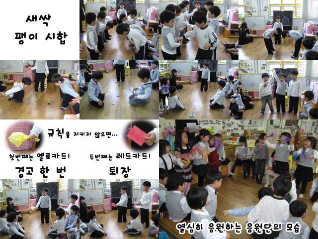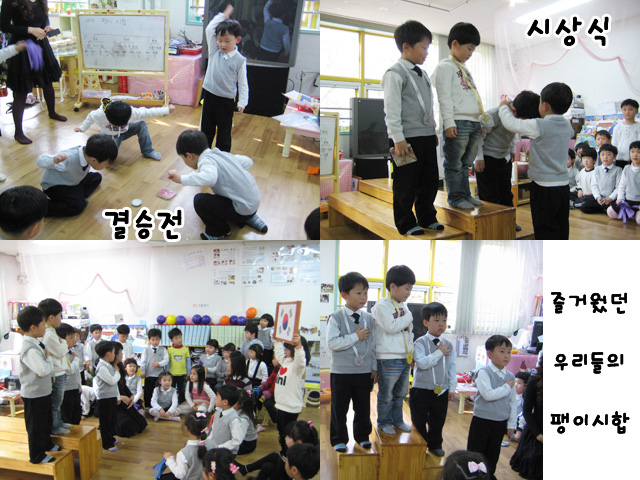 4명의 유아들이 나와 그림으로 그렸고 아이들은 실제 시상대와 가장 비슷한 그림을 찾아 “그거 맞아요.”를 외쳤다. T:그럼 이것은 어떻게 만들거야? "그거는 (노란)의자로 하면 되잖아.” “아니. 그거는 (높이가)다 똑같잖아.” “그러면 높이가 다 다른거는....”“우리가 앉는 (3단)의자는?” 교사:3단 의자를 이용해서 어떻게 할 수 있을까? (아이들은 의자를 옮겨 만들어 보았다. 그런데 계단식으로 되어버렸다.) T: 이렇게 하면 저기(칠판) 그림이랑 같은 것 같니? “아니요~ 달라요. 다시요!” (그러면서 이번에는 2번째 의자를 1번 옆으로 옮겼다.) “이제 됐다. 이제 그림이랑 같아요.” T:그래 이제 같아졌네. 그럼 조금 있다가 시상식 할 때 이렇게 사용하면 되겠다. “그런데요. 우리가 한 가지 빠뜨린게 있어요.” T: 그게 뭐야? “여기(시상대)에 보면요. 1. 2. 3 이라고 숫자가 적혀져있는데 없잖아요.” “아~ 맞네. 그렇네.” “그러면 만들면 되지 뭐! 숫자 적어서 붙이면 되니깐 쉽다.” 이렇게 아이들은 서로의 경험과 생각을 나누며 하루 하루 시합준비를 열심히 해나갔다.▣우리끼리 팽이시합▣