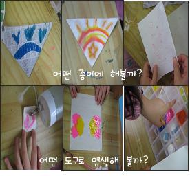 자연염색전 관람의 경험은 하늘반 미술영역의 활동으로 이어집니다. 머메이드지, 도화지, 신문지, 화선지 등 염색이 잘 되기 위한 종이를 탐색하고 사인펜, 물감 등의 도구들을 이용해 염색을 시도합니다. 유아들은 여러 시도 끝에 종이가 얇은 화선지에 가장 염색이 잘 된다는 것을 발견합니다. 처음에는 네모 모양으로 한번, 세모 모양으로 한번 접어 무늬를 그리다가 접는 방법을 달리하여 신기한 무늬가 찍혀 나오도록 합니다.