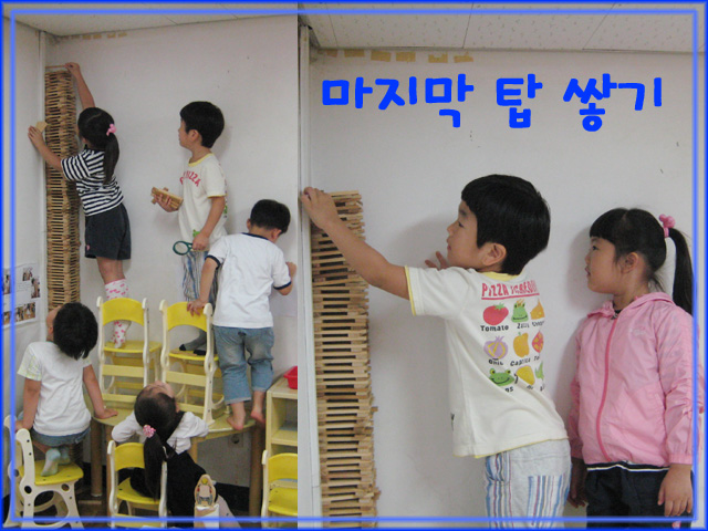 그렇게 탑을 쌓던 중 이제 또 까치발조차 닿지 않는 순간이 되자 아이들은 작게 속삭이듯 이야기 한다. “이제 못하겠다.” “아~ 정선이가 왔으면... 다연이가 왔으면...”(천장까지 쌓기를 하기에 제일 적합하다고 아이들 스스로 못박아버린 키가 제일 큰 두 명의 친구다.)“정선이가 할 수 있겠나? 이거 못한다 이거 자주 못해봐라 못하지.” “그럼 연습하면 되지뭐.” “키는 되지만 안된다. 그러다가 다 부서지면” “다시하면 되지.” “힘들잖아.” “참으면 되지!” “참으면 땀 뻘뻘~나잖아.”
