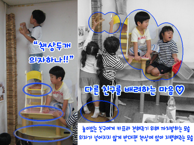 첫 번째로 사용했던 분홍색 작은 책상을 큰 책상위에 올려놓고 그 위에 의자를 올리더니 한 유아가 올라간다. “그래 그래 그러면 되겠다.” “선생님 우리 봐요. 우리 이제 되요. 책상 두 개에 의자 한 개 예요.”
