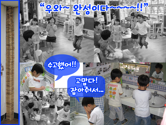 이렇게 아이들은 옥신각신 서로의 생각과 주장을 나름대로 타당성을 가지고 끊임없는 반론을 제시하며 쌓아가고 있었다. 그렇게 한 참 고민하던 중 한 유아가 마지막 비책을 내놓았다.