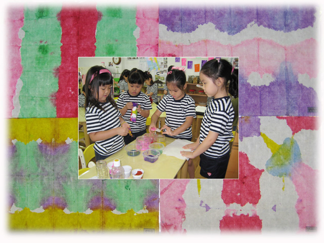 한지를 고깃고깃 접어서 여러 가지 색 물감에 담갔다가 다시 빼내어 조심조심 펼쳐서 말려두는 염색놀이.