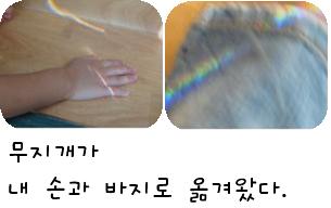 유아 : 계단에 무지개가 있었는데 내 손을 갖다 대니깐 손에 무지개가 생겼어요. 바지에도요.