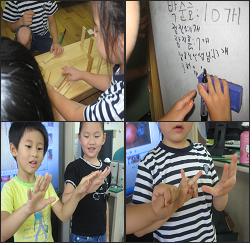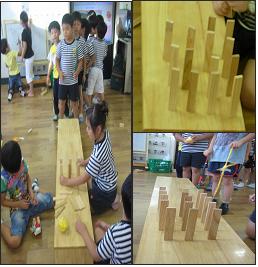 옆에 사진을 보시니 무엇을 하는 것처럼 보이십니까? 하늘반에서는 지금 카프라를 이용한 볼링게임이 한창입니다.15개의 카프라를 세운 뒤 공을 굴려 가장 많이 넘어뜨리는 사람이 1등을 하는 게임이지요. 처음에는 넘어뜨린 카프라와 바닥에 있던 카프라가 섞여 수를 세는데 어려움이 많았어요. 그리고 일정한 배열이 아니라 카프라를 마음대로 세우다 보니 몇 개를 세었는지 혼돈스럽기 까지 했지요. 그런데 15개면 5개씩 3줄로 세우면 쉽게 세울 수 있다는 것을 발견했어요. 이제는 카프라를 몇 개 세웠는지 금방 알 수 있죠.