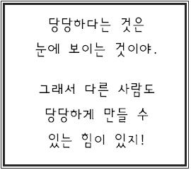 그래서 좀 더 재미있게 놀이를 하기 위한 방법으로 놀이의 이름과 자세를 바꾸자고 합니다. 친구들의 다양한 생각 중에서 손을 드는 투표를 통해 한가지를 결정하기로 합니다. 많은 친구들이 선택한 놀이의 이름은 ‘꼬마야 꼬마야 까꿍’이며 자세는 ‘손 짚고 점프하기’입니다. 놀이의 지루함을 해결하기 위해 고민 끝에 놀이의 이름과 자세를 바꾼 친구들. 놀이는 다시 재미를 찾을 수 있을까요?<당당하다는 것 Ⅱ>