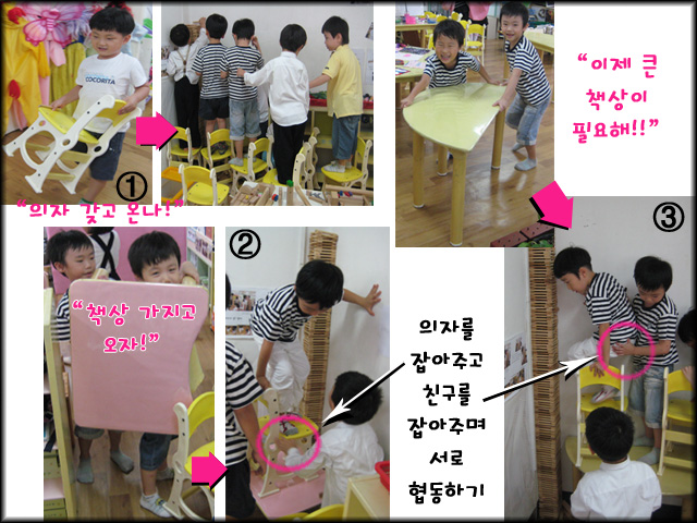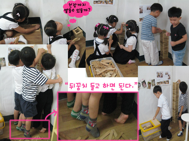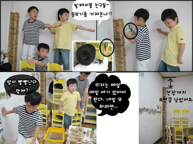 “책상 가지고 온나. 책상!” 낮은 책상을 가져와 놓고 그 위에 의자를 올려서 더 높게 올라선 아이들은 계속 탑을 쌓았고 계속해서 점점 높아지자 윗부분이 잘 안보여 탑이 살짝 기울어지게 되었다. 그렇게 이제 더 이상 높아질 수 없다고 단정지어버린 몇 몇의 유아는 돌아서서 “다음에 또 하지머”하곤 나가버렸고 남은 유아들은 또 다른 방법을 생각해냈다.