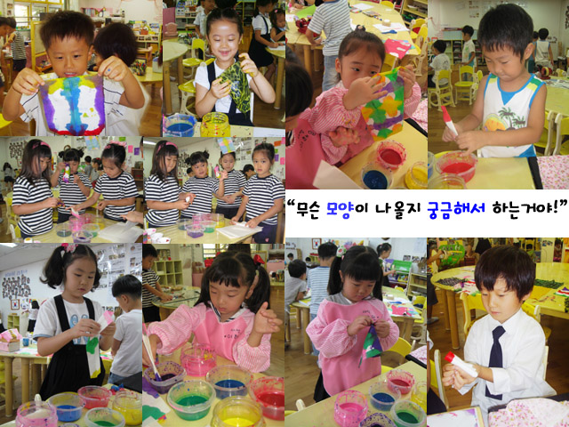 놀이시간... 오늘도 몇 명의 유아들은 이곳에 관심을 가진다. 종이를 접어 물감에 담갔다가 빼내면 종이에 물이 들어 알록달록 변하는 놀이. 열심히 놀이하는 아이들에게 한 유아가 다가와서 물었다.