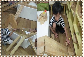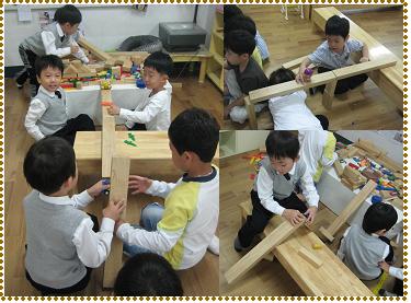 - 내리막길에 관심을 가지며 쌓기 단상과 바닥을 연결하던 아이들이 3단 의자를 이용하여 쌓기단상과 연결하였다. 밑에는 작은 사각형 블록을 대어 잘 무너지지 않게 하였다.
