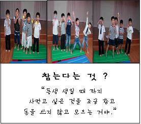 감사에 이어 <참는다는 것>이 필요한 순간에 대해 자신들의 경험에 비추어 의미와 가치를 되새겨 보는 시간을 가졌습니다. 유아1: 충치 생겼을 때 초콜렛, 사탕 먹고 싶은 것을 참는 거야. 유아2: 수업시간에 물이 마시고 싶어도 마칠 때 까지 조금 기다리는 거야. 유아3: 친구가 먼저 블록을 가지고 놀면 나도 하고 싶어도 조금 기다리는 거야. 유아3: 동생 생일 때 까지 사먹고 싶은 것을 참고 돈을 쓰지 않고 모으는 거야. 대부분의 유아들은 참는다는 것을 타인을 인식함으로써 타인을 통한 배려에서 비롯되어 그 가치를 경험해 나가고 있었습니다. 어느덧 우리 아이들은 기다림이 주는 가치를 인식하고 자신만이 아닌 더 넓은 눈으로 세상을 바라보고 타인을 배려해야 할 때가 필요함을 알아가며 경험해 나가고 있었습니다.