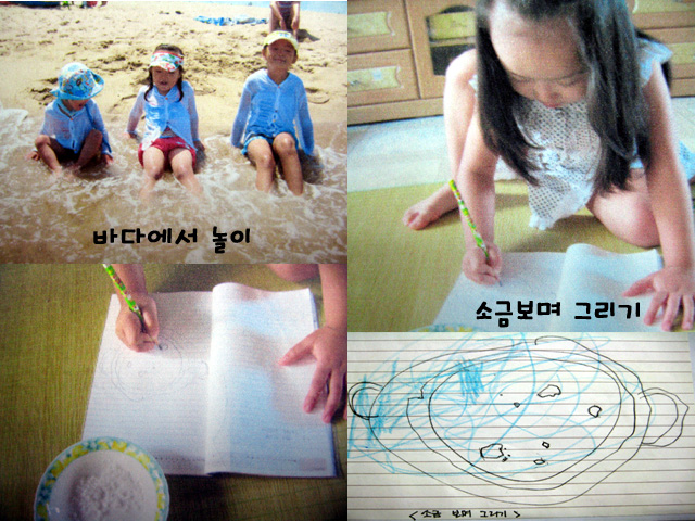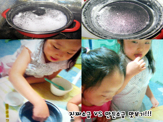 영덕 외할머니 댁 앞바다에서 하루 종일 모래장난과 물놀이를 하고 집으로 돌아왔다. 엄마:물놀이 재밌었나? /언니:바닷물을 조금 먹었는데 짜웠어요. /승희:진짜 짜웠어요.(놀면서 바닷물을 조금 먹은 듯 한데, 한껏 들뜨고 신나게 웃으며...) 소금으로 바다를 만든 것 같았어요. /언니:맞아요. 그리고 책에서 봤는데 바닷물로 소금을 만든다 했어요. /엄마:바닷물로 어떻게 소금을 만들던데? /승희:가마솥에 넣어서 불 붙혀서 기다리면 소금이 되요. <아이들은 소금을 만들어보기로 하였고 그 전에 소금을 관찰하며 그림도 그려보았다.> 승희:냄새 안나요./언니:색깔도 없다. 그냥 하얀색이다. <한참 뒤, 삼촌에게 부탁해 바닷물을 집으로 가져왔다.> 승희:(코를 병에 데어보고)물고기 냄새~언니:흐흐~비린내~ <소금을 만들기 위한 실험이 시작되었다.> 언니:몇 분동안 끓이면 되지? /승희:한5분? 그럼 소금될지도 모른다. 소금이 되면 반찬하는데 넣으면 돼요./ 언니: 바닷물을 삶으면 왠지 뜨거운 바닷물이 될 것 같아... 뜨겁고 짜운... <8시45분에 시작된 실험은 9시 15분이 돼서야 끝날 수 있었다.> 아이들: 바닷물이 없어졌어. /승희: 바닷물이 뜨거워서 수증기로 변했는거 같아요. /언니:증발한거다./ 승희:둘레에 있는 하얀게 결국엔 소금이 되는 것 같아요. 엄마! 그럼 우리 진짜 만들어져있는 소금도 먹어보고 이 소금(냄비에)도 먹어보자./ <맛을 보더니> 언니: 맛이 똑같아요. /승희: 소금이다(뿌듯해하며)바닷물로 소금을 만들 수 있어요. 실험 성공~~