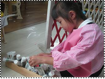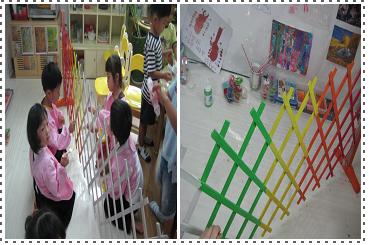 -어린이들은 빨간색 아크릴물감으로 문을 칠한다.유아: 어. 빨간색을 너무 많이 칠했다. 그러면 다른 색은 못 칠할 수도 있는데...