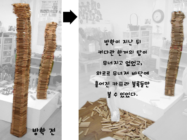 방학이 지나고 달라진 교실의 모습에 대해 이야기 나누던 중, 방학 전 쌓아두고 간 카프라 탑 두 개 중 하나가 무너진 것을 알게 되었다. 누가 부셨을까? 잠시 궁금해 하던 아이들. 그러나 이젠 ‘누가 왜 무너뜨렸는지’ 보다는 ‘이 탑이 무너지지 않게 하는 것’에 더욱 아이들의 관심이 집중되는 모습을 볼 수 있었다. 아이들은 탑을 다시 잘 쌓는 것 보다 중요하고 급한 것이 무너지지 않게 보존하는 것이라고 생각한 모양이다. 그래서 카프라 탑이 무너지지 않게 하는 방법을 찾고 해결을 해보기로 하였다.