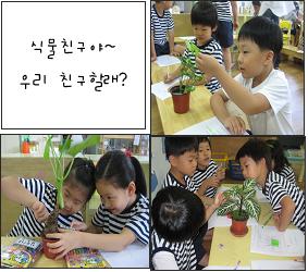 10년 뒤 아이들의 삶을 좌우하게 될 것은 실력이 아니라 도덕 이라고 합니다. 하늘반 친구들이 모두 도덕적인 능력을 가진 사람으로 성장했으면 하는 바램에 꼭 필요하지만 추상적인 개념의 <가치>라는 것에 대해 이야기 나누어 보는 시간을 가졌습니다. 이번 주에는 하늘반 친구들과 <감사>라는 가치로 이야기를 나누어 봅니다. 자신이 감사해 봤던 경험들... 또 누군가로 부터 감사의 표현을 받아봤던 경험들을 이야기 해보면서 세상에는 감사할 일도 감사함을 느낄 것들도 참 많다는 생각을 해봅니다. 그런데 <감사>를 표현할 수 있는 것은 사람에게만 가능한 것일까요? 하늘반 친구들과 하나, 둘씩 떠올려 봅니다. 우리가 소중하게 느끼지 못했지만 감사한 것들에 대해서...하늘반 교실부터 찬찬히 둘러봅니다. 3월 초 부터 하늘반 친구들에게 맑은 공기와 시각적인 풍요로움을 주고 있었지만 평소에 관심 있게 들여다보지 않았던 식물이 눈에 띕니다. 유아들은 고마운 마음을 친구가 되는 방법으로 표현해 보고자 합니다. 움직이지 않고 말도 할 수 없어 친구가 될 수 없을거라 생각했는데 마음으로 다가가는 방법을 알아가면서 조금씩 가깝게 다가갑니다. 친구를 사귀기 위해 그 친구의 생김새, 좋아하는 것을 알아가듯이 관심을 두지 않았던 식물친구도 다가가 눈으로, 코로, 손으로, 마음으로 느껴보면서 몰랐던 사실을 알아가기도 하고 친구에게 어울리는 멋진 이름을 지어주면서 친밀감을 형성해 나갑니다. 감사함을 느낄 수 있는 것은 멀리 있지 않다는 것, 그리고 감사함은 표현할 때 더 커진다는 것을 느끼는 소중한 시간이었습니다.