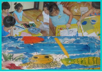 - 잠시 후 준수와 미숙, 준우랑 미경 이렇게 편이 나뉜 듯 했다. 서로 경쟁이라도 하는 듯 이야기를 나누며 열심히 하였다. 스케치북에 그림을 그리고 지점토를 붙여 색칠!! 작품완성!