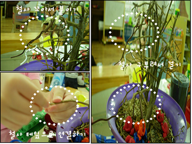 -철사를 구부려 나무와 연결하려 합니다. 나무와 철사를 연결한다는 자체가 너무 힘듭니다. 테잎으로 양 끝을 연결하기도 하지만 시간이 지나자 철사는 떨어져 버립니다. 그러자 철사 끝을 구부려서 나무에 걸어 둡니다.