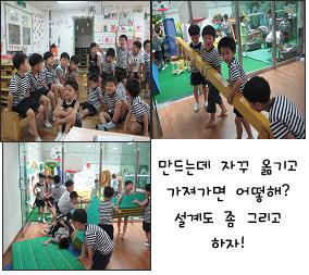 유아2: 야! 그거 우리가 여기 다리 만든건데!유아3: 이거 저기에 갖고 가서 다리 만들껀데! 유아1: 우리가 먼저 갖다 놨거든! 거기 놔 둬라. 유아3: 너거만 쓰나? 우리도 쓰자! 유아4: 만들어놓으면 갖고 가고, 또 옮기고. 언제 만드노? 우리 설계도 좀 그려서 하자!