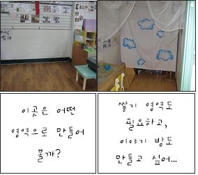 유아3: 쌓기가 필요해요! 우린 정말 쌓기가 하고 싶어요. 유아4: 이야기 방이 있었으면 좋겠어요. 친구랑 선생님이랑 이야기를 나눌 수 있는 방이요! 교사: 그러면 어디에다 쌓기 영역이랑 이야기 방을 만들면 좋을까? 교사의 물음에 친구들은 미리 비워둔 공간을 가리킵니다. 만들고 싶은 영역은 2개, 비어있는 공간은 한 곳... 어떻게 하면 좋을까요? 유아5: 도예 영역을 없애요. 유아6: 그래도 도예영역 가고 싶은 친구들도 있는데! 유아7: 식당영역 없애요. 냄새도 나잖아요. 유아8: 안돼~식당영역에서 반죽만들기 할거란 말이야.