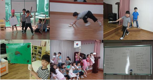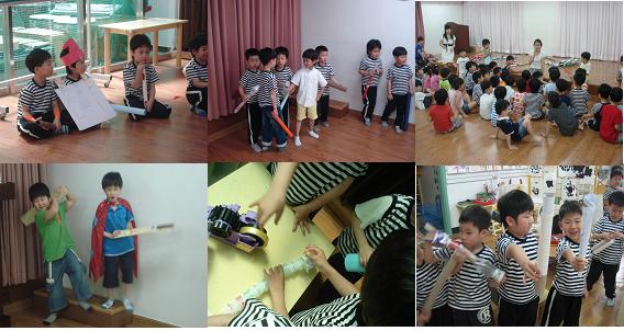 5월의 어느날.. 영역활동시간 교실 밖 복도에서는 공격하라!! 라는 말과 함께 분주하게 뛰어다니는 소리가 들리기 시작했습니다. 아이들은 하나 둘 교실 문에 있는 작은 창문을 통해 복도에서 울려 퍼지는 소리를 눈으로 보고 듣기 시작했고 심지어 교실 문을 열고 뛰어나가는 아이도 있었습니다. 7세반 교실만이 있는 2층 복도에서는 하늘반과 햇살반의 공격놀이가 진행중 이었습니다. 벽하나 사이에 있는 하늘반과 햇살반의 서로에 대한 경계로 인해 시작된 공격놀이는 어른들이 고정관념을 가지고 바라보는 그런 위험한 놀이가 아닌 아이들의 욕구를 풀어주는 말 그대로 하나의 놀이였습니다. 아이들의 손에는 매체물을 이용해 만든 무기가 쥐어져 있었으며 손에 아무것도 쥐지 않고 놀이에 참여하기 위해 복도를 향했던 이슬반의 아이들은 “공격놀이를 하려면 규칙을 먼저 알아야 해 무기가 있어야 하고 무기끼리만 싸울 수 있어 뒤에서 공격해서도 안돼”하늘 반 선생님의 놀이 참여방법을 듣고 난 후 아이들은 무기를 만드느라 분주해졌습니다. 아이들이 공격놀이를 해도 될까? 위험하진 않을까? 이것이 교육적으로 어떤 효과를 가져 올까? 하는 불안감에 혼란도 왔지만 아이들은 늘 교사가 보이지 않는 곳에서 이러한 움직임의 대화를 하고 있었고 교사는 이러한 놀이를 아이들이 왜 좋아하는 것인지 왜 하고 있는지에 대한 궁금증으로 허용되지 않았던 놀이를 허용되는 놀이로 지켜보기로 했습니다.아이들은 일주일에 2~3번의 공격놀이를 통해 스스로 규칙도 만들어가고 왕과 대장, 군사라는 서열을 만들어 갔으며 공격놀이의 군사보다는 응원으로 참여하는 유아, 무기를수리해줌으로 인해 참여하는 유아, 무기를 개발하는 것에 목적을 두고 참여하는 유아로 성향에 따라 참여하는 방법도 각자 달랐습니다 한 달의 공격놀이를 통해 아이들은 공격놀이가 좋은것일까? 마냥 노는것이 좋은것일까? 하는 의문이 생겼습니다 아이들은 새로운 놀이 “잡기 놀이”를 제시했고 아이들은 잡기 놀이에도 공격놀이 못지 않은 매력을 느끼고 있었습니다, 공유를 통해 아이들은 잡기놀이를 하면서 달릴수 있어서 좋다고 이야기를 합니다. 그럼에도 불구하고 아이들은 영역활동 시간이 되면 언제나 처럼 여러가지 매체물을 이용해 무기를 만들고 응원도구를 만들고 있습니다. 아이들이 원하는 것은 공격놀이일까요? 아니면 마냥 뛰어다니는 놀이일까요? 아니면 또 다른 무언가가 있는 걸까요?