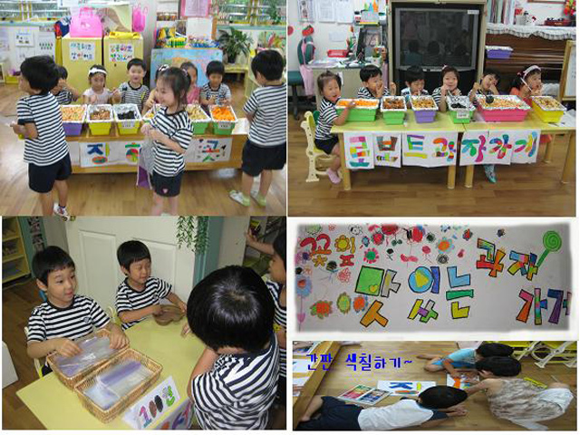 오늘은 형님들이 준비한 식당이여서 더욱더 맛있는 것 같아요. 시장을 한바퀴 돌고나니 다리도 조금 아프지만 내가 물건을 샀다는 기쁨에 아픈것도 금방 잊어버립니다. 과자를 계속 담아 조금은 힘들지만 맛있는 과자를 먹을 친구들, 형님들을 생각하니 입가에 웃음이 지어 집니다. 돈을 가지고 계획하고 직접 구매해 보는 경험을 한 꽃잎반 친구들, 나에게 꼭 필요한 물건을 사야함과 새것은 아니지만 아나바다 시장에서의 아껴쓰는 경험을 해 보아요.