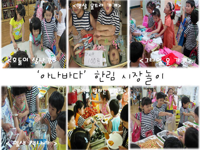 한림 아나바다의 시장에는 없는 것이 없어요. 장난감가게, 악세사리가게, 문구점, 과자가게, 옷가게, 분식점. 어떤 물건을 살지 곰곰이 생각을 해 보고 여러반을 다니며, 물건을 고를 거랍니다.