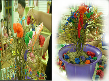 유아3: 이제 원숭이 끼우는데 없어요. 앗! 따가워(원숭이를 나뭇가지에 끼운다)