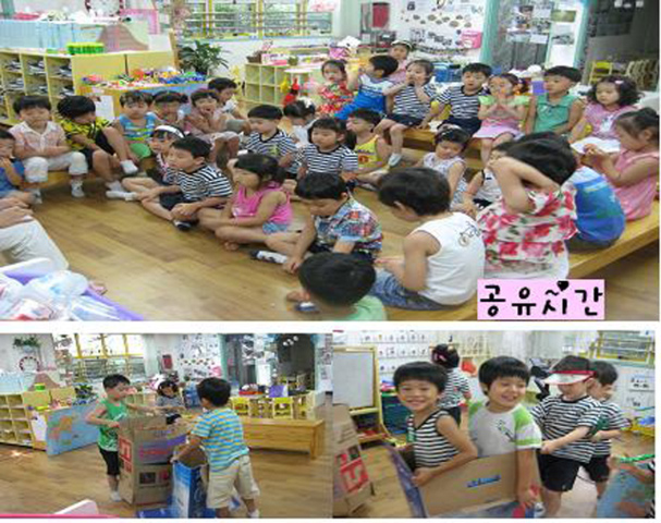 아이들의 놀이를 위해 교실에 놓아둔 종이박스! 아이들은 종이 박스를 집이라 명칭하며 들어가고, 기차, 버스라 하며 들어가서 움직입니다.