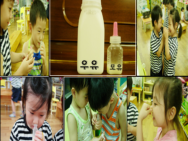 동생이 있는 친구가 모유를 유치원에 가져와서 진짜 모유를 보며 유아들은 우유와 비교를 합니다.