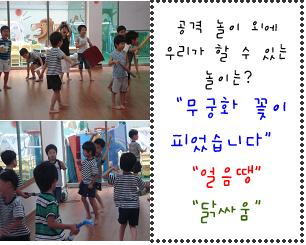 *유치반에서 항상 공격 놀이를 원하는 친구들도 있지만 원하지 않는 친구들도 있습니다. 이 친구들은 어떤 놀이가 하고 싶을까? 친구들과 이야기를 나누면서 ‘무궁화 꽃이 피었습니다’,‘얼음 땡’,‘닭싸움’ 등의 다양한 놀이, 게임을 이야기합니다. 그리고 이 중에서 내가 하고 싶은 놀이를 선택하고, 유치반 친구들 중에서 같은 게임을 하고 싶은 친구끼리 모입니다.