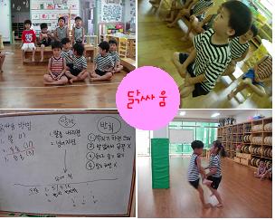 *이슬반 1명, 하늘반 7명이 모였습니다. 놀이의 방법은 ‘닭다리를 만들어 두 손으로 잡고 무릎으로 공격한다’라는 것이 많은 친구의 지지를 받아 결정됩니다. 그리고 발을 내리거나 넘어지면 탈락입니다. 박치기를 하고 밟아서 공격하고, 손으로 밀거나 발로 차면 반칙입니다. 이 모든 내용들은 친구들이 긴 시간 대화 끝에 정해진 것입니다. 그리고 경기를 합니다. ‘2명씩 짝을 지어서 해 보고 이긴 사람끼리 왕중왕을 가린다’의 방법과 ‘5명씩 닭싸움을 한다’ 의 방법으로 경기를 해 봅니다. 이 두 방법으로 모두 해 본 친구들은 각 방법의 좋은 점과 보충할 점에 대해 생각합니다.