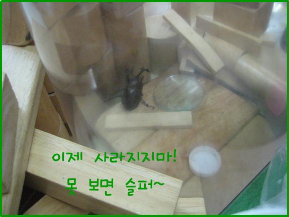 -아침에 잎새반에 들어와보니 어제 있었던 장수풍뎅이가 또 사라졌다.벌써 2번째 탈출~~!! 이번엔 아이들의 동선이나 추측에도 찾을 수가 없었다.