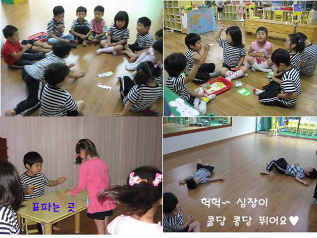 유아4: 원래 애기는 잘 자랄려면 한 살 때는 엄마 젖먹고, 두 살 때는 죽을 먹어요. 그 다음은 밥을 먹어요. 유아5: 아기는 빨아 먹어야 해요.