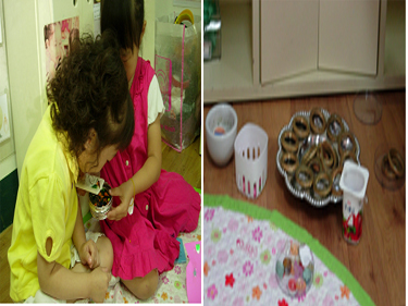 유아들은 음식을 만들어 아기에게만 밥을 줍니다. 그 밥의 종류는 조금씩 바뀌지만 그 음식들을 먹으면 아기가 자란다고 합니다. 아프면 먹이는 약을 소개하며 꽃잎반 친구들과 공유하는 시간을 가져봅니다.