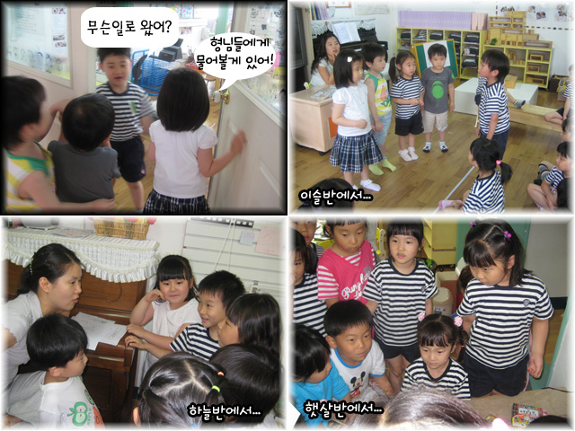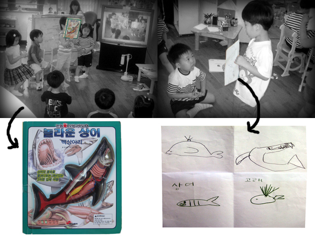 햇살반 형님들> 상어는 이빨이 뾰족해! 아니 비슷한 것 같은데... 고래는 물을 뿜어낼 수 있지만 상어는 못해! 고래는 꼬리가 날개모양이고 등에 딱딱한 것도 있어! 상어는 입이 뾰족하고 자기보다 큰 동물도 작은 동물도 다 잡아먹을 수 있는 무서운 동물이야!그렇게 이야기를 듣고 이슬반에서는 상어 책을 받아왔고 하늘반에서는 고래와 상어를 비교해서 그린 그림을 받을 수 있었고 다시 교실로 돌아온 아이들은 다른 친구들에게 설명을 해주었다.