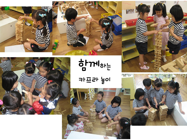 한 유아가 새로운 놀이를 하고 있다. 가까이 가 살펴보니 카프라를 이용해 탑처럼 높이 쌓는 놀이를 하고 있었다. 한명이 시작한 놀이는 곧 2명...3명...4명으로 점점 늘었고 이렇게 혼자놀이와 함께 놀이가 가능한 카프라 탑 쌓기 놀이가 점점 모든 아이들에게 번져가고 있었다.