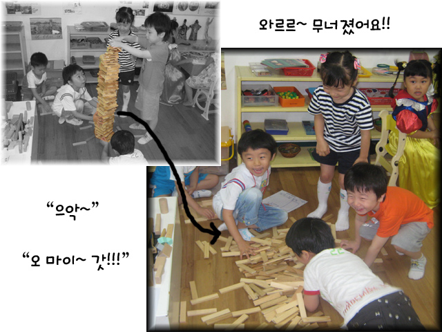 “우와~ 진짜 많이 했다.” “나도 같이 하자” “야! 우리 이만~큼 쌓아보자!” “안 된다! 니 지난번에 못 들었나?! 우리 강당에 갔을 때 강당 선생님이(안전교육 해주셨던...) 우리키보다 높이 쌓으면 블록이 떨어져서 친구 머리도 다치고 다리도 다친다 했잖아.” “그러면 이까지만 하자!” “근데 나는 더 하고(쌓고) 싶은데...”