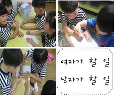 유아들은 설거지, 청소를 여자가 하는 일 또는 남자, 여자 모두 할 수 있는 일, 남자가 해야 하는 일로 각각 다르게 생각합니다. 각 가정에서 눈으로 보았고, 자신의 머리 속에 자리 잡은 남자, 여자의 할 일에 대한 생각을 표현하는 것 같았습니다. 그래서 유아들의 생각을 좀 더 깊게 알아보기 위해 남자가 할 일, 여자가 할 일을 조별로 종이에 적어봅니다.