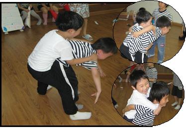진 팀이 이긴 팀을 업어주기로 하였다. 친구의 작은 등에 업히는 아이들의 모습은 놀이기구를 타는 듯한 즐거운 표정이었다. T: 친구에게 업혀 보니 기분이 어떠니? C1: 마음이 편안해요. 원래 마음이 변했어요. C2:공격할 때는 화난 마음이었는데 업히고 나니 마음이 좋았어. 서로업어주고 승리를 축하해주며 공격하는 전쟁터가 화해의 장소로 변했다. 이 기회를 통해 모든 일에서 이기는 것만이 결코 좋은 것이 아님을 깨달았을까?