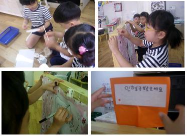 유아들은 인형극 준비과정에서 다른 유아들에게 홍보를 하기위해 막과 그 위에 ‘인형극 보러 오세요’라는 글귀의 종이를 붙여놓았다.