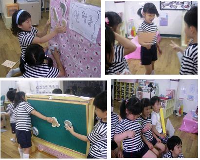 대본 읽을 유아가 정해졌고 천에 붙지 않는 인형들을 다시 부직포판에 옮겨서 붙이며 인형극을 하기 시작했다.