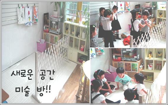 - 좁은 미술영역으로 미술활동이 적절하게 일어나지 않아 고민하다 잎새반에 미술영역을 확장하기로 하였다. 그냥 자리를 넓히기 보다는 아이들이 조금 더 자유롭고 즐겁게 미술 활동을 할 수 있게금 방의 형식으로 넓은 공간을 지원한 후 새로운 공간에 대한 잎새반 유아들의 반응을 지켜 보았다.